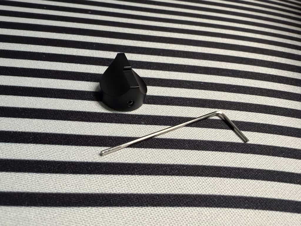 本体フレームを開ける際にはこのノブキャップは取り外す必要があります。付属のL字レンチでネジを緩めて外してください。