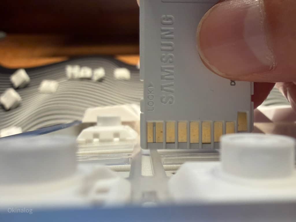 肉眼では確認しづらくて、解説も難しいんだけど手持ちのメモリーカードを滑らせてみたところ、いちばん上部(F1等が並ぶ列)のプレート境界線だけメモリーカードがぶつかるレベルに角度が上がっているのがみてとれた。