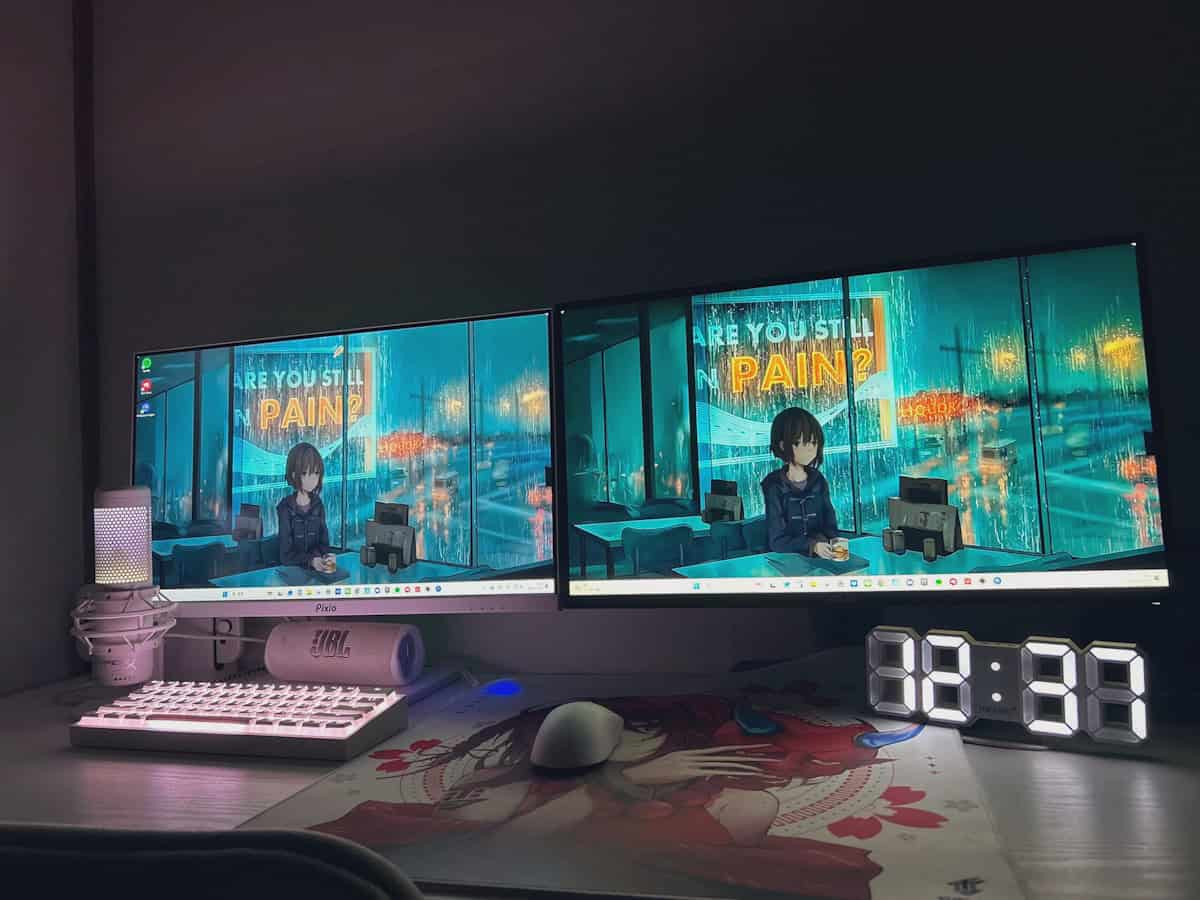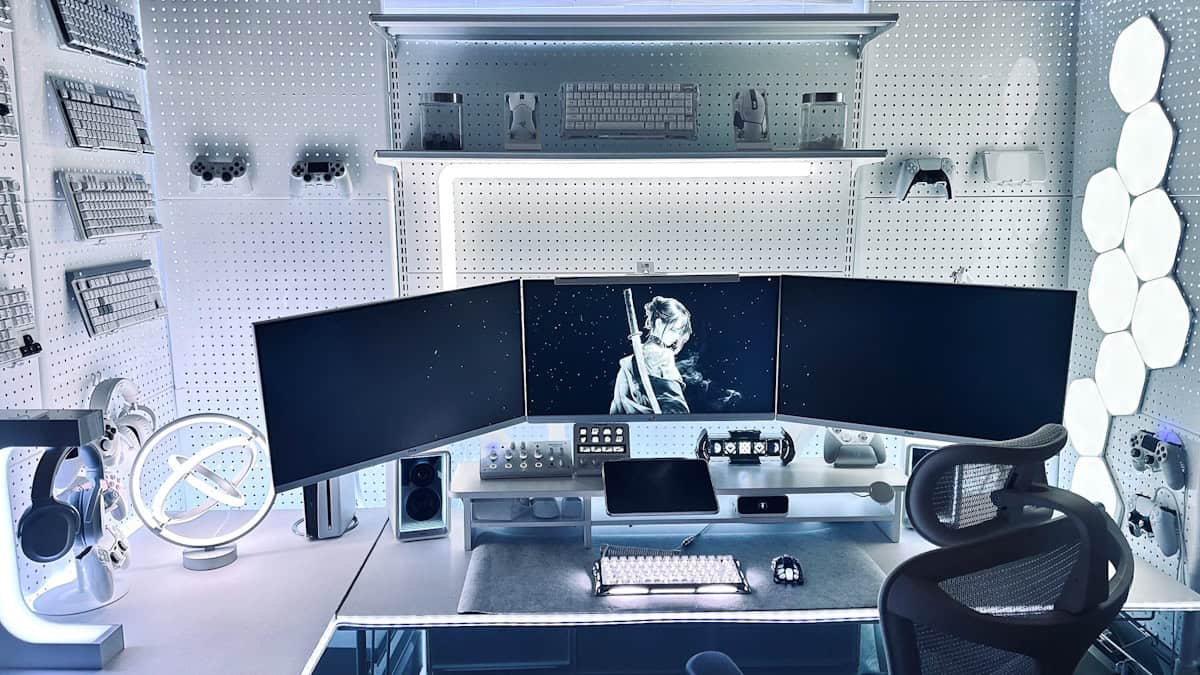 それでもクアッドモニターをここまで神秘的に魅せるのは、壁紙もだけど照明の効果も強そうだ。