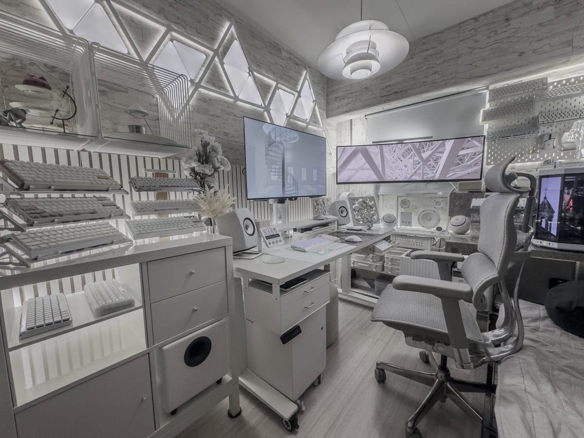 KEFとTRANSPARENTのスピーカーに、ウルトラワイドなモニター、デザイン性に長けたキーボードラック、どれも翁じゃ手が出ないほど高価で高品質な製品ばかり。