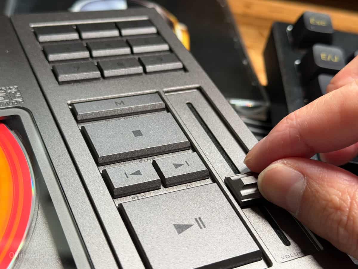 スライダーをずらして蓋をあけ、重たい蓋をヌッと持ち上げて、ディスクをカチッと装着し、重たい蓋をそっと閉じ、ボリュームノブをじわじわと持ち上げて音量を調整。