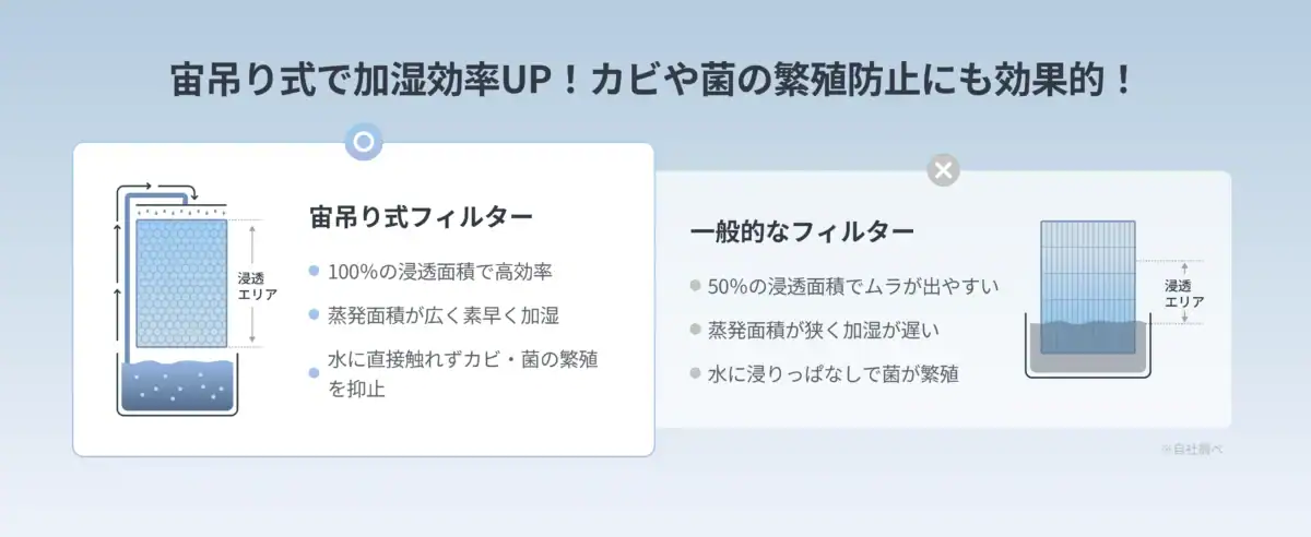 しかも、その水を含ませるフィルターも吊り下げ式になってるから、従来の漬け置きフィルターを採用した加湿器みたくカビの繁殖がしづらい構造となっている。