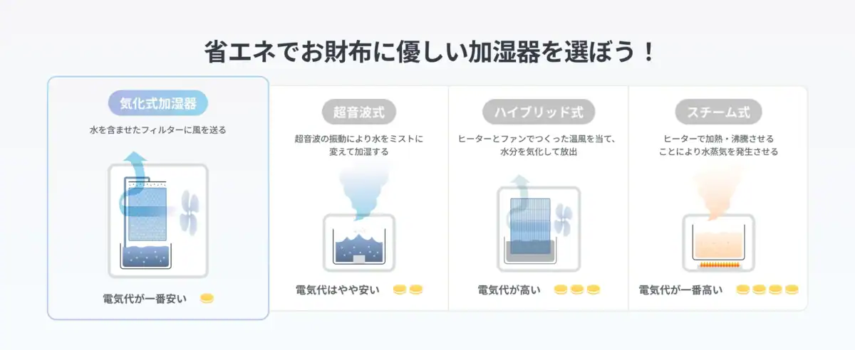 • 加熱式:いちばん加湿力が高くスピーディで衛生的。その反面熱湯を扱うため安全面が不安